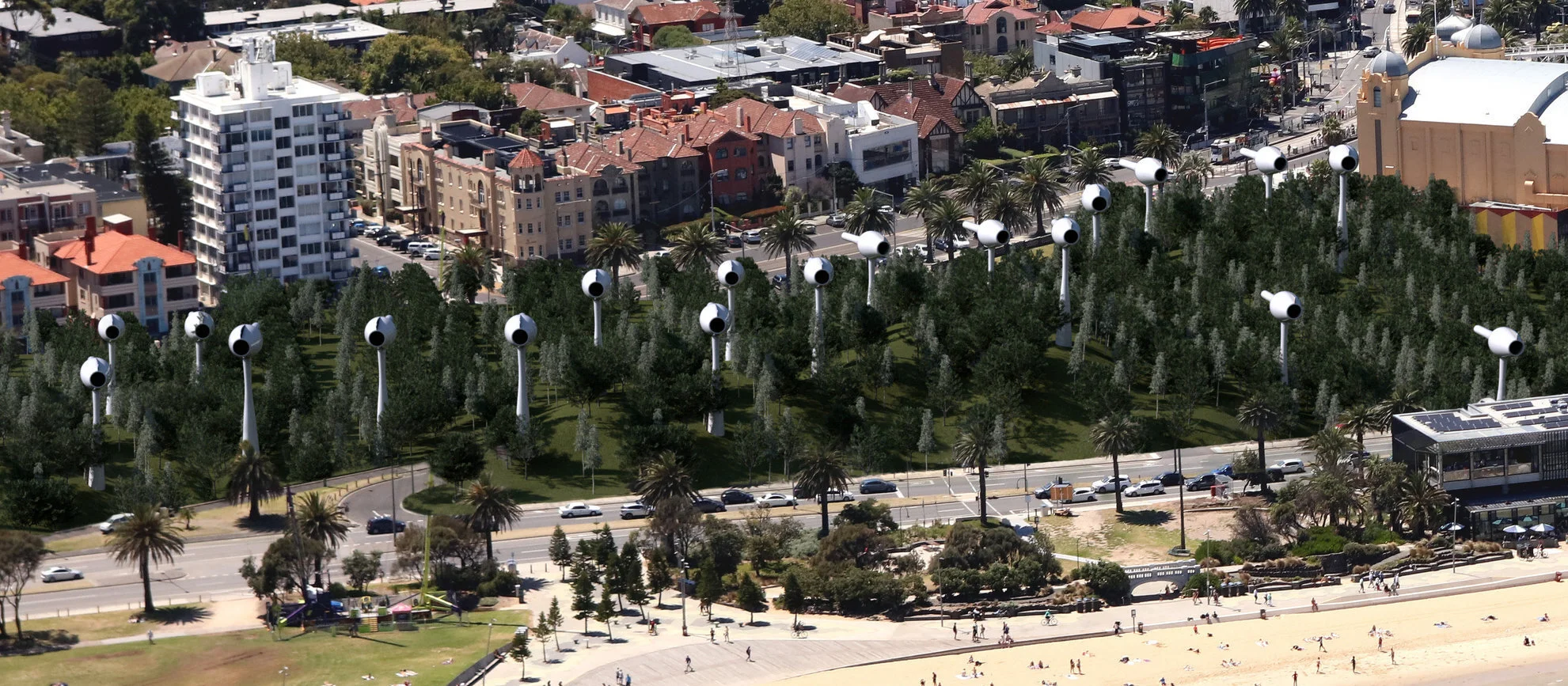 The project incorporates an innovative blade-less wind turbine for a proposed waterfront public park. As the seaflute generates over 1200 MWh of electricity for St Kilda, the cutting edge technology of the turbines make this a seamless, silent and clean power plant that has blended into the social fabric of the beach town. Moreover, to add to the public facade of these wind turbines, they are equipped with an apparatus that is able to produce music from the strong wind energy.
